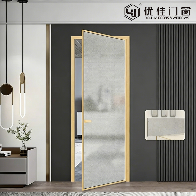 Дверь, выполненная из текстурированного декоративного стекла премиум-класса, имеет прочную узкую металлическую раму с изысканной золотистой отделкой, которая дополняет различные интерьерные палитры. Тонкая линейная текстура стекла добавляет визуальную глубину и художественную привлекательность, равномерно рассеивая свет, чтобы избежать резких бликов. Он оснащен точными петлями и минималистской ручкой для тихой и стабильной работы и соответствует высоким стандартам дизайна современной жилой и коммерческой архитектуры.
